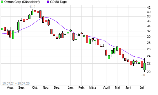 Mit dem Anstieg auf 23,40 EUR hat die Omron-Aktie am 09.07.2025 die 50-Tage-Linie nach oben gekreuzt.Die Omron-Aktie befindet sich seit dem 11.11.2024 im langfristigen Abwärtstrend und hat in ...weiterlesen