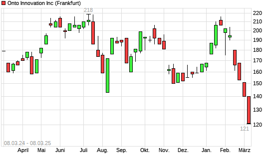 Mit dem Rücksetzer auf 121,00 EUR hat die Onto Innovation-Aktie (ISIN US6833441057) am 07.03.2025 ein neues 12-Monats-Tief erreicht und damit den Kurs vom 04.03.2025 eingestellt.