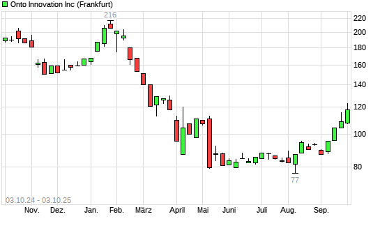 Mit dem Anstieg auf 121,00 EUR hat die Onto Innovation-Aktie (ISIN US6833441057) am 02.10.2025 ein neues 6-Monats-Hoch erreicht und damit den Kurs vom 24.09.2025 eingestellt.