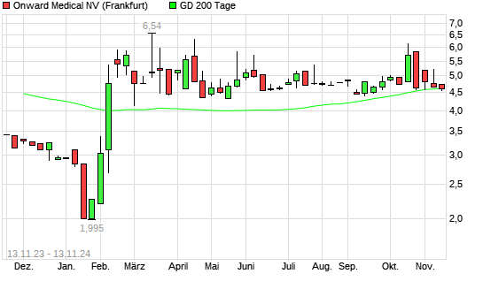 Mit dem Rücksetzer auf 4,90 EUR hat die Onward Medical-Aktie am 12.11.2024 die 200-Tage-Linie nach unten gekreuzt.