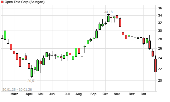 Mit dem Rücksetzer auf 22,73 EUR hat die Open Text-Aktie (ISIN CA6837151068) am 29.01.2026 ein neues 6-Monats-Tief erreicht und damit den Kurs vom 28.01.2026 eingestellt.