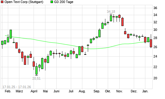 Mit dem Rücksetzer auf 26,57 EUR hat die Open Text-Aktie am 16.01.2026 die 200-Tage-Linie nach unten gekreuzt.