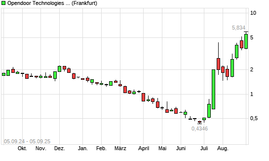 Mit dem Anstieg auf 5,24 EUR hat die Opendoor Technologies-Aktie (ISIN US6837121036) am 04.09.2025 ein neues 3-Jahres-Hoch erreicht und damit den Kurs vom 13.09.2022 eingestellt.