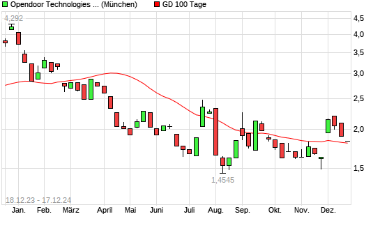 Mit dem Rücksetzer auf 1,79 EUR hat die Opendoor Technologies-Aktie am 16.12.2024 die 100-Tage-Linie nach unten gekreuzt.