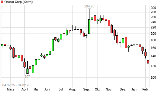 Mit dem Rücksetzer auf 129,64 EUR hat die Oracle-Aktie (ISIN US68389X1054) am 03.02.2026 ein neues 6-Monats-Tief erreicht und damit den Kurs vom 30.01.2026 eingestellt.