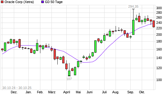 Mit dem Rücksetzer auf 235,70 EUR hat die Oracle-Aktie am 29.10.2025 die 50-Tage-Linie nach unten gekreuzt.
