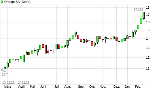 Mit dem Anstieg auf 17,21 EUR hat die Orange-Aktie (ISIN FR0000133308) am 12.02.2026 ein neues 10-Jahres-Hoch erreicht und damit den Kurs vom 11.02.2026 eingestellt.