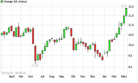 Mit dem Anstieg auf 11,70 EUR hat die Orange-Aktie (ISIN FR0000133308) am 07.03.2025 ein neues 12-Monats-Hoch erreicht und damit den Kurs vom 04.03.2025 eingestellt.