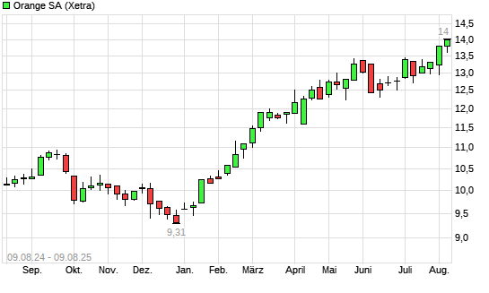 Mit dem Anstieg auf 13,95 EUR hat die Orange-Aktie (ISIN FR0000133308) am 08.08.2025 ein neues 5-Jahres-Hoch erreicht und damit den Kurs vom 06.08.2025 eingestellt.