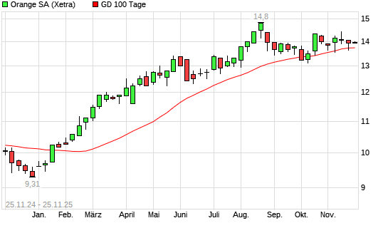Mit dem Anstieg auf 13,96 EUR hat die Orange-Aktie am 24.11.2025 die 100-Tage-Linie nach oben gekreuzt.