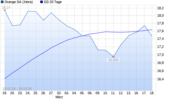 Mit dem Rücksetzer auf 17,26 EUR hat die Orange-Aktie am 18.03.2026 die 20-Tage-Linie nach unten gekreuzt.