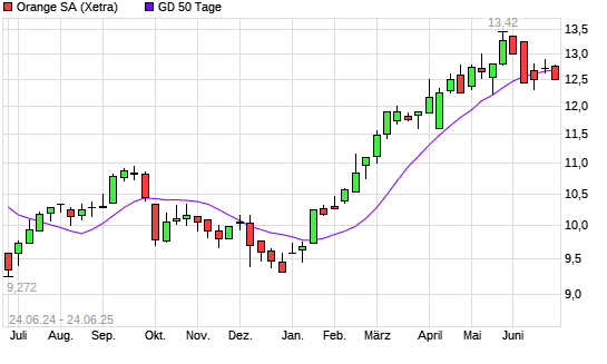 Mit dem Rücksetzer auf 12,70 EUR hat die Orange-Aktie am 23.06.2025 die 50-Tage-Linie nach unten gekreuzt.
