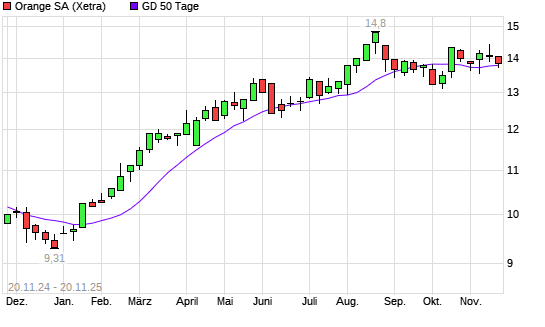 Mit dem Rücksetzer auf 13,72 EUR hat die Orange-Aktie am 19.11.2025 die 50-Tage-Linie nach unten gekreuzt.