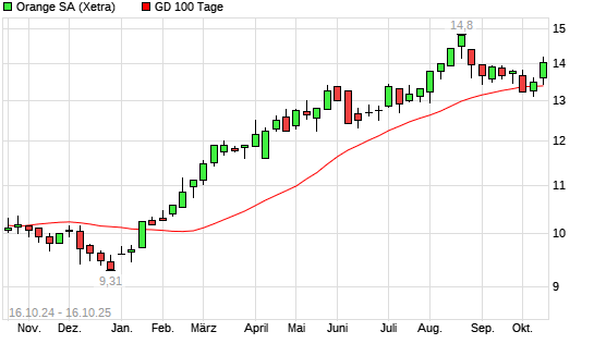 Mit dem Anstieg auf 14,04 EUR hat die Orange-Aktie am 15.10.2025 die 100-Tage-Linie nach oben gekreuzt.Die Orange-Aktie befindet sich seit dem 15.01.2025 im langfristigen Aufwärtstrend und hat ...weiterlesen