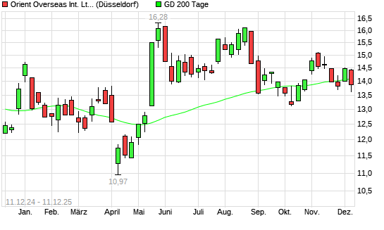 Mit dem Rücksetzer auf 13,66 EUR hat die Orient Overseas-Aktie am 10.12.2025 die 200-Tage-Linie nach unten gekreuzt.