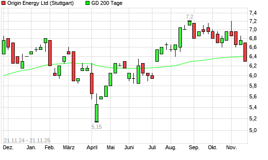 Mit dem Rücksetzer auf 6,35 EUR hat die Origin Energy-Aktie am 20.11.2025 die 200-Tage-Linie nach unten gekreuzt.