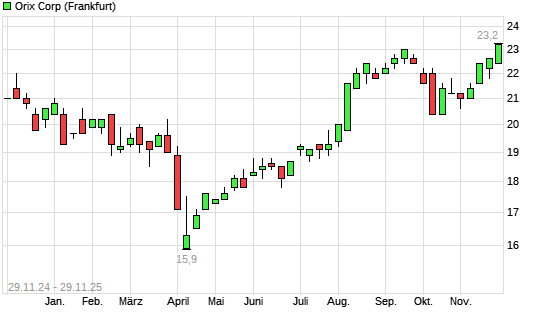 Mit dem Anstieg auf 23,20 EUR hat die Orix-Aktie (ISIN JP3200450009) am 28.11.2025 ein neues 10-Jahres-Hoch erreicht und damit den Kurs vom 19.09.2025 eingestellt.