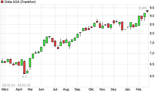 Mit dem Anstieg auf 9,31 EUR hat die Orkla-Aktie (ISIN NO0003733800) am 17.02.2025 ein neues 10-Jahres-Hoch erreicht und damit den Kurs vom 04.10.2016 eingestellt.