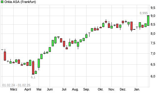 Mit dem Anstieg auf 8,99 EUR hat die Orkla-Aktie (ISIN NO0003733800) am 31.01.2025 ein neues 5-Jahres-Hoch erreicht und damit den Kurs vom 06.02.2020 eingestellt.