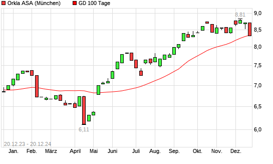 Mit dem Rücksetzer auf 8,11 EUR hat die Orkla-Aktie am 19.12.2024 die 100-Tage-Linie nach unten gekreuzt.