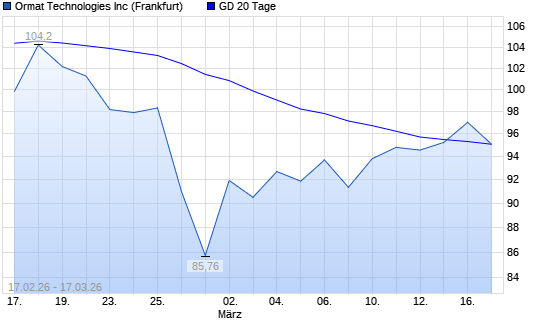 Mit dem Anstieg auf 97,00 EUR hat die Ormat Technologies-Aktie am 16.03.2026 die 20-Tage-Linie nach oben gekreuzt.