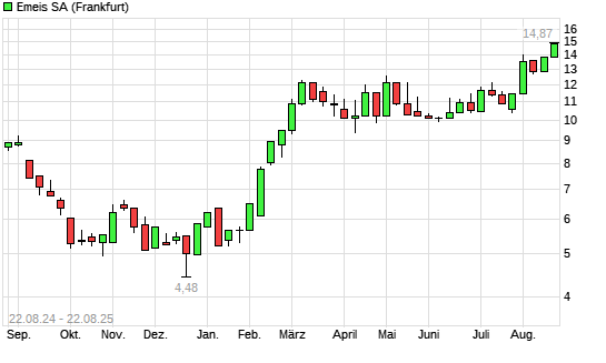 Mit dem Anstieg auf 14,75 EUR hat die Orpea-Aktie (ISIN FR001400NLM4) am 21.08.2025 ein neues 12-Monats-Hoch erreicht und damit den Kurs vom 20.08.2025 eingestellt.