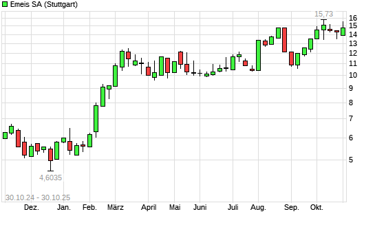 Mit dem Anstieg auf 15,49 EUR hat die Orpea-Aktie (ISIN FR001400NLM4) am 29.10.2025 ein neues 12-Monats-Hoch erreicht und damit den Kurs vom 09.10.2025 eingestellt.