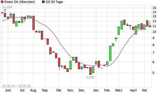 Mit dem Rücksetzer auf 10,75 EUR hat die Orpea-Aktie am 14.05.2025 die 50-Tage-Linie nach unten gekreuzt.