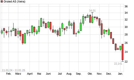 Mit dem Rücksetzer auf 40,20 EUR hat die Orsted-Aktie (ISIN DK0060094928) am 10.01.2025 ein neues 12-Monats-Tief erreicht und damit den Kurs vom 09.01.2025 eingestellt.