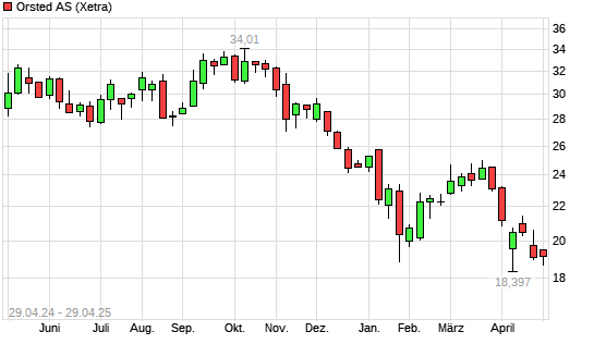 Mit dem Rücksetzer auf 33,64 EUR hat die Orsted-Aktie (ISIN DK0060094928) am 28.04.2025 ein neues 5-Jahres-Tief erreicht und damit den Kurs vom 01.11.2023 eingestellt.