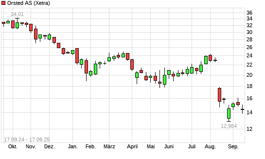 Mit dem Rücksetzer auf 14,10 EUR hat die Orsted-Aktie (ISIN DK0060094928) am 16.09.2025 ein neues All-Time-Low erreicht und damit den Kurs vom 25.08.2025 eingestellt.