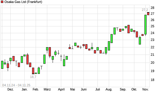 Mit dem Anstieg auf 27,20 EUR hat die Osaka Gas-Aktie (ISIN JP3180400008) am 03.11.2025 ein neues All-Time-High erreicht und damit den Kurs vom 31.10.2025 eingestellt.