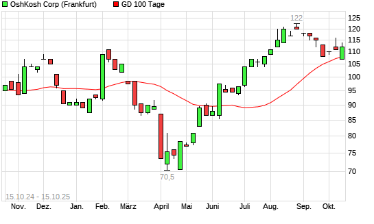 Mit dem Anstieg auf 114,00 EUR hat die Oshkosh-Aktie am 14.10.2025 die 100-Tage-Linie nach oben gekreuzt.