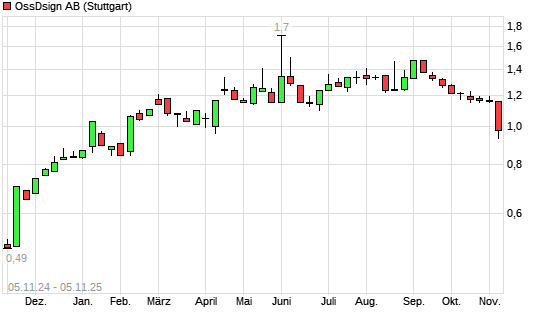 Mit dem Rücksetzer auf 0,99 EUR hat die OssDsign-Aktie (ISIN SE0012570448) am 04.11.2025 ein neues 6-Monats-Tief erreicht und damit den Kurs vom 06.05.2025 eingestellt.