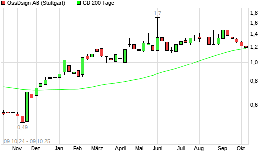 Mit dem Rücksetzer auf 1,16 EUR hat die OssDsign-Aktie am 08.10.2025 die 200-Tage-Linie nach unten gekreuzt.
