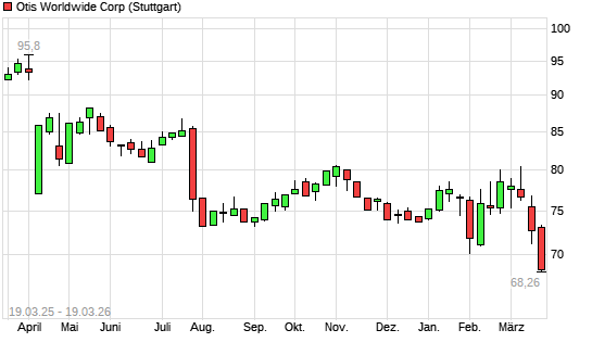Mit dem Rücksetzer auf 69,00 EUR hat die Otis Worldwide-Aktie (ISIN US68902V1070) am 18.03.2026 ein neues 3-Jahres-Tief erreicht und damit den Kurs vom 25.10.2023 eingestellt.