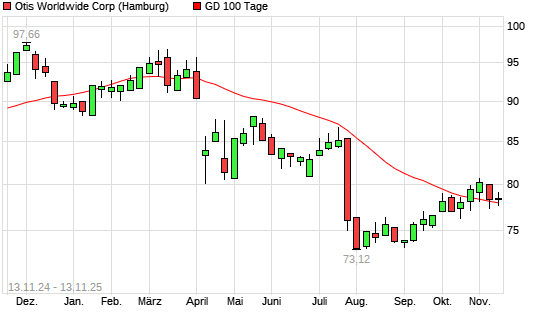 Mit dem Anstieg auf 79,04 EUR hat die Otis Worldwide-Aktie am 12.11.2025 die 100-Tage-Linie nach oben gekreuzt.