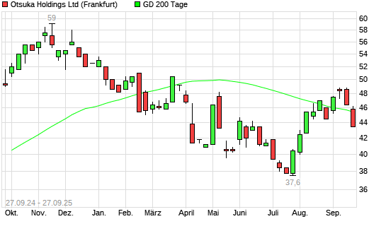Mit dem Rücksetzer auf 43,80 EUR hat die Otsuka Holdings-Aktie am 26.09.2025 die 200-Tage-Linie nach unten gekreuzt.
