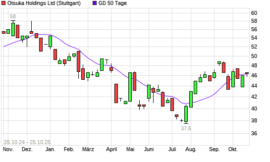 Mit dem Rücksetzer auf 46,20 EUR hat die Otsuka Holdings-Aktie am 24.10.2025 die 50-Tage-Linie nach unten gekreuzt.