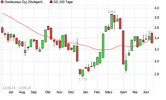 Mit dem Rücksetzer auf 3,34 EUR hat die Outokumpu-Aktie am 12.06.2025 die 100-Tage-Linie nach unten gekreuzt.