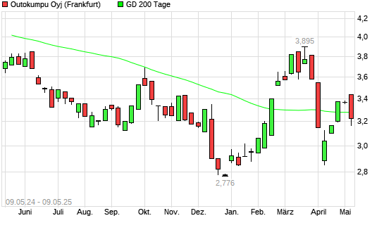 Mit dem Rücksetzer auf 3,17 EUR hat die Outokumpu-Aktie am 08.05.2025 die 200-Tage-Linie nach unten gekreuzt.