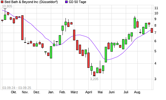 Mit dem Rücksetzer auf 6,79 EUR hat die Overstock.com-Aktie am 02.09.2025 die 50-Tage-Linie nach unten gekreuzt.