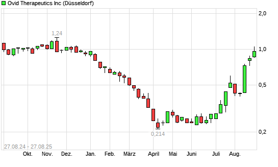 Mit dem Anstieg auf 0,94 EUR hat die Ovid Therapeutics-Aktie (ISIN US6904691010) am 26.08.2025 ein neues 6-Monats-Hoch erreicht und damit den Kurs vom 25.08.2025 eingestellt.