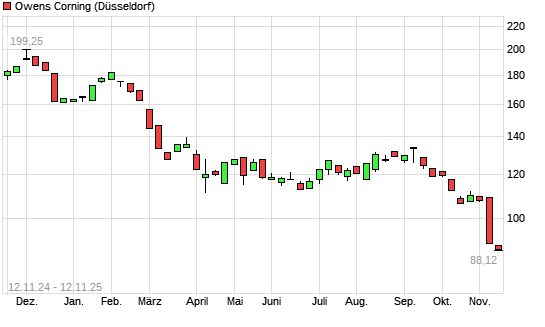 Mit dem Rücksetzer auf 87,20 EUR hat die Owens Corning-Aktie (ISIN US6907421019) am 11.11.2025 ein neues 12-Monats-Tief erreicht und damit den Kurs vom 10.11.2025 eingestellt.