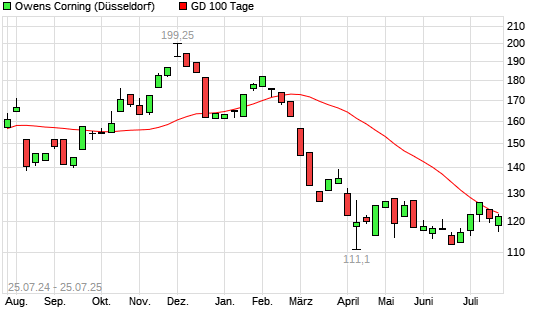 Mit dem Rücksetzer auf 121,10 EUR hat die Owens Corning-Aktie am 24.07.2025 die 100-Tage-Linie nach unten gekreuzt.