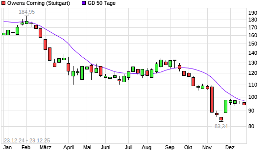 Mit dem Rücksetzer auf 97,18 EUR hat die Owens Corning-Aktie am 22.12.2025 die 50-Tage-Linie nach unten gekreuzt.
