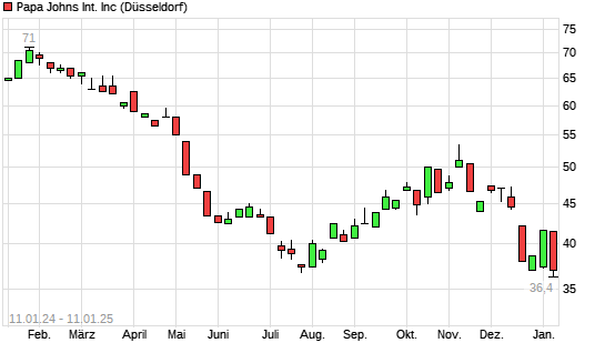 Mit dem Rücksetzer auf 35,60 EUR hat die PAPA JOHNS International-Aktie (ISIN US6988131024) am 10.01.2025 ein neues 3-Jahres-Tief erreicht und damit den Kurs vom 09.01.2025 eingestellt.