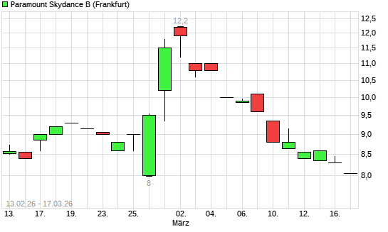 Mit dem Rücksetzer auf 8,30 EUR hat die PARAMOUNT SKYD. B O.N.-Aktie (ISIN US69932A2042) am 16.03.2026 ein neues 10-Jahres-Tief erreicht und damit den Kurs vom 16.02.2026 eingestellt.