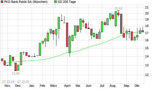 Mit dem Anstieg auf 17,42 EUR hat die PKO Bank Polski-Aktie am 16.10.2025 die 200-Tage-Linie nach oben gekreuzt.