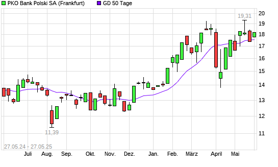 Mit dem Anstieg auf 17,99 EUR hat die PKO Bank Polski-Aktie am 26.05.2025 die 50-Tage-Linie nach oben gekreuzt.